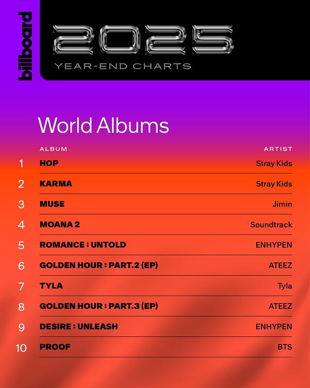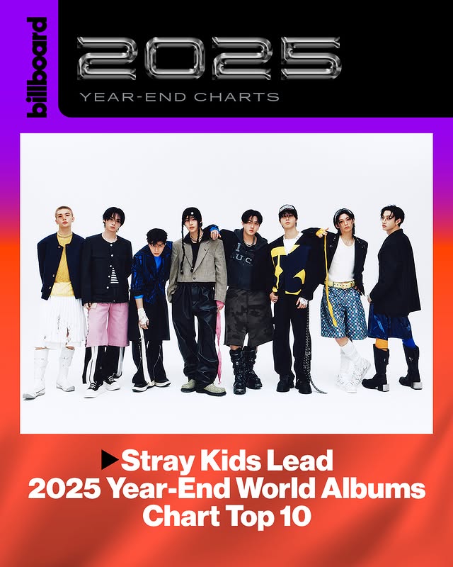 Stray Kids 再度於國際音樂市場寫下重要里程碑。Billboard 公布 2025 年度年終榜單後,團體以《HOP》與《KARMA》分別拿下「World Albums」第 1 與第 2 名,連續第二年包辦冠亞位置,成為少數能在該榜單長期維持頂尖表現的 K-pop 男團。